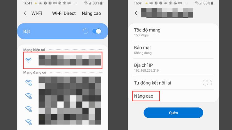 | Bước 2: Nhấn vào mạng bạn đã kết nối rồi chọn mục “Nâng cao” để cài đặt lại IP. |